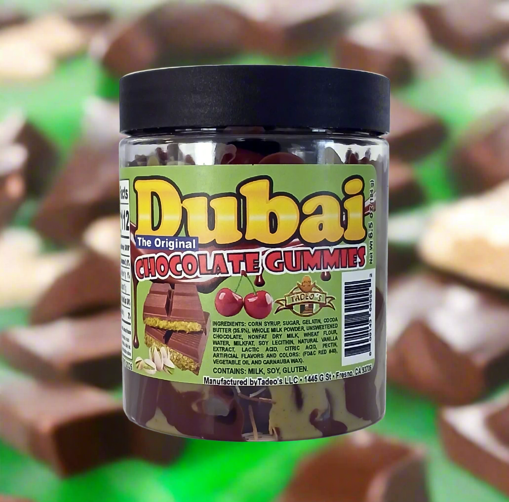Our version of the highly popular Dubai chocolate with our own blend of yummy ingredients. Tadeo's Dubai Chocolate features flavorful lemon-flavored or cherry-flavored gummies, covered with a blend of chocolate, pistachio cream and kadaifi for a flavorful snack delight